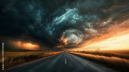 Fototapeta premium 1. A dramatic road stretching toward an approaching storm, with dark,...