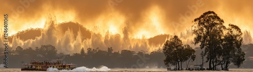 Fototapeta premium A dramatic scene of a boat navigating through waters with a backdrop of intense flames and smoke from a wildfire affecting nearby hills.