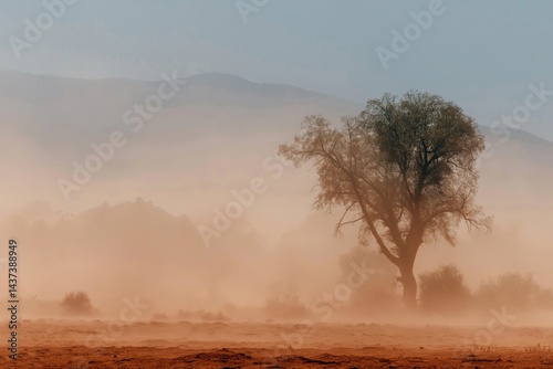 © Nadia, Fototapeta premium A dramatic scene of a lone dry tree standing amidst a swirling dusty desert storm, fine red dust filling the air and partially obscuring the background, faint silhouettes of distant hills