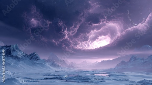 Fototapeta premium A dramatic scene of a purple stormy sky over a snowy mountainous landscape with ice and cold elements.