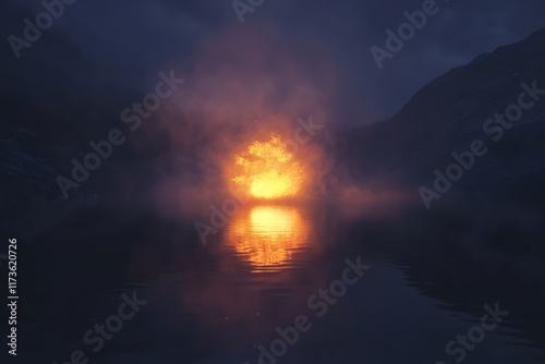 Naklejka premium A dramatic scene of an explosion reflected in a calm lake surrounded by misty mountains.