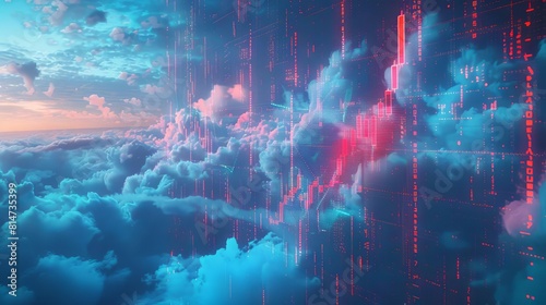 © ZeNDaY, Fototapeta premium A dramatic scene of financial charts and digital currency symbols projected onto clouds, representing the vast potential of DeFi