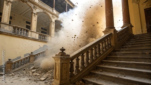 Fototapeta premium A dramatic scene shows a large explosion destroying a grand staircase in an...