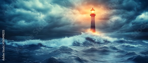 Fototapeta premium A dramatic seascape featuring a glowing lighthouse amidst stormy clouds and crashing waves, symbolizing hope and navigation through turbulent waters.