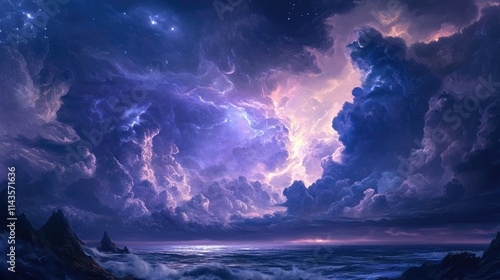 Fototapeta premium A dramatic seascape with vibrant clouds and a starry sky, evoking a sense of...
