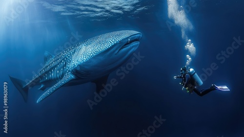 © Sampao, Naklejka premium A dramatic shot of a diver swimming alongside a massive whale shark, highlighting the majesty of these gentle giants in their natural habitat.