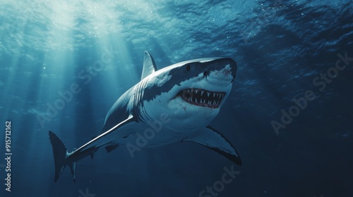 Naklejka premium A dramatic shot of a great white shark circling its prey, showcasing its powerful jaws and streamlined body