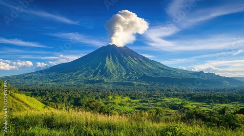 © Natchooda, Fototapeta premium A dramatic shot of an active volcano under a clear blue sky, with white smoke rising from the crater, capturing the power and natural beauty of the eruption