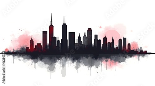Naklejka premium A dramatic silhouette of a city skyline, blending shadows with bold red accents, evoking a vibrant urban atmosphere.