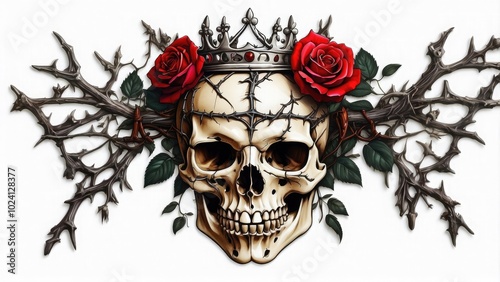 © Turab, Fototapeta premium A dramatic skull sticker with a crown of thorns and a rose between its teeth, isolated on white background.