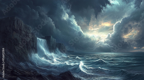 © Intach, Fototapeta premium A dramatic sky filled with dark storm clouds over a restless sea, with waves crashing against rocky cliffs