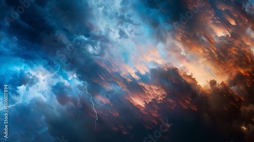 Fototapeta premium A dramatic sky showcasing a blend of dark storm clouds and bright orange hues, illuminated by lightning.