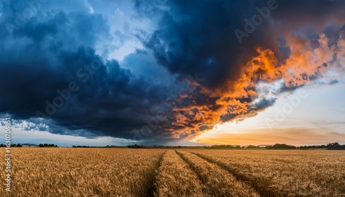 Obraz premium a dramatic sky split between stormy dark blue clouds and fiery orange clouds over a golden field symbolizing contrasting weather or elements