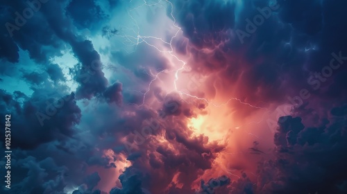 Fototapeta premium A dramatic sky with dark clouds illuminated by a powerful lightning strike.