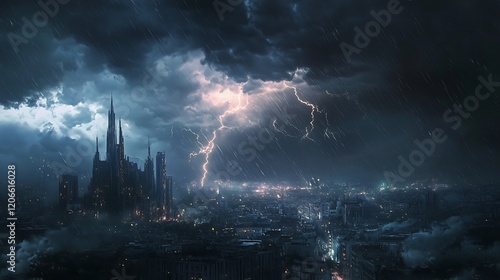 © projek, Obraz premium A dramatic storm over a city skyline with lightning and rain.