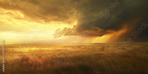 Fototapeta premium A dramatic storm rolling over an open prairie, with dark clouds, a distant tornado, and golden sunlight breaking through in streaks. The powerful and intense setting captures nature's raw beauty.