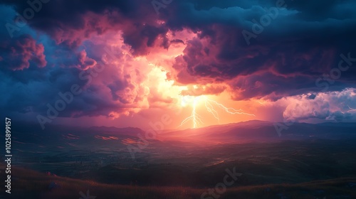 © HuynhThiThuy, Fototapeta premium A dramatic storm scene featuring a cloud-to-ground lightning strike over a hilly landscape, with the bolt illuminating the entire sky. The hills are clearly visible in the bright light,