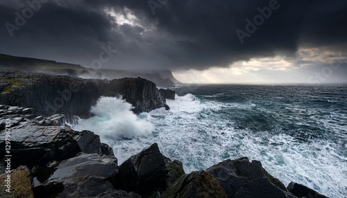 © Photo by mQ, Obraz premium A dramatic stormy coastline with massive waves crashing against jagged black cliffs, creating a powerful, raw natural landscape.