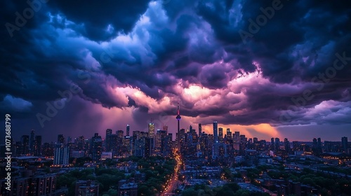 Fototapeta premium A dramatic, stormy sky hangs over a city skyline at night, illuminated by...