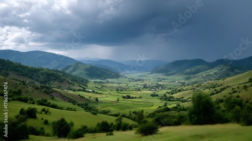 © Thares2020, Obraz premium A dramatic stormy sky looms over a lush green valley with rolling hills and scattered rural settlements
