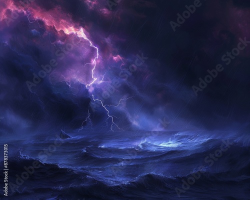 Fototapeta premium A dramatic stormy sky with lightning striking over a raging sea.