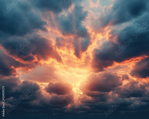 © Preeyanuch, Fototapeta premium A dramatic sunset illuminates the sky, casting vibrant orange and gold hues among dark, swirling clouds.