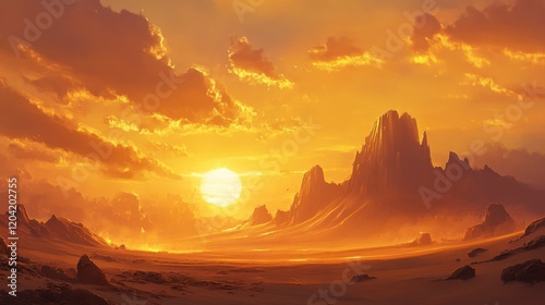 Fototapeta premium A dramatic sunset over a desert landscape with towering sand dunes and golden...