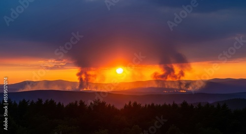 © Farhan, Fototapeta premium A dramatic sunset over a mountain range, with plumes of smoke rising from distant wildfires, creating an ominous and powerful environmental landscape.