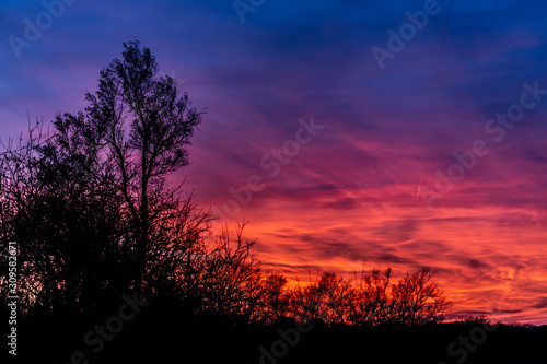 © Phyre Sky, Fototapeta premium A dramatic sunset over silhouetted trees with blue, gold, and red clouds.