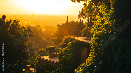 Fototapeta premium A dramatic sunset over the Hanging Gardens of Babylon with golden light...