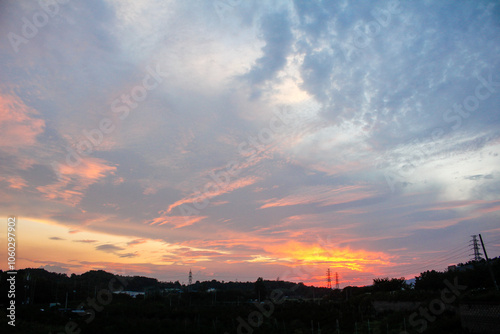 © yashis007, Obraz premium A dramatic sunset sky with colourful glowing clouds and a silhouetted landscape below