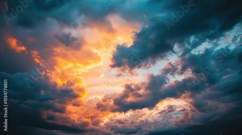 Obraz premium A dramatic sunset with dark clouds and vivid colors, creating a striking...