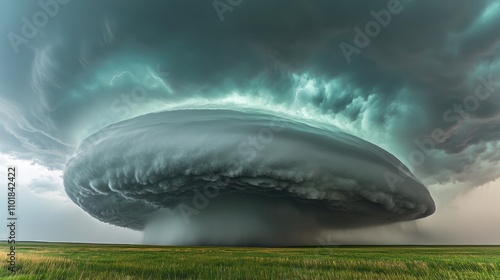 Obraz premium A dramatic, swirling storm cloud resembling a flying saucer over a grassy...