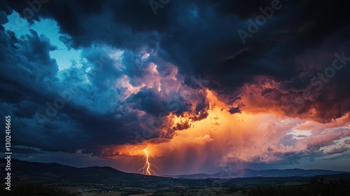 © Soknea, Obraz premium A dramatic thunderstorm with dark clouds and lightning in the sky