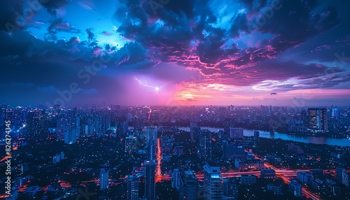 Fototapeta premium A dramatic thunderstorm with lightning illuminating the night sky over a city skyline