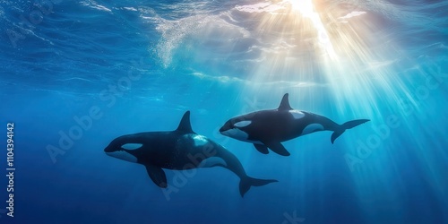 © Blue Harvest Stock, Fototapeta premium A dramatic underwater shot of Orca Whales hunting seals near the surface