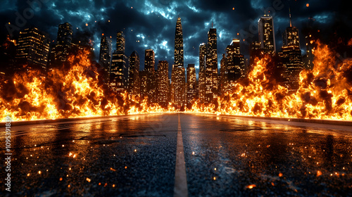 © Butsarakham, Fototapeta premium A dramatic urban scene with a fiery backdrop, showcasing flames engulfing a city skyline under a stormy sky.