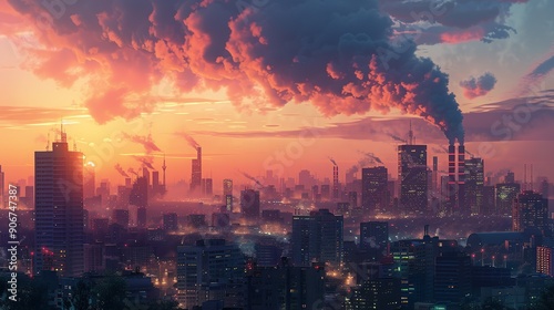 Fototapeta premium A dramatic view of a city skyline with visible smoke and pollution,...