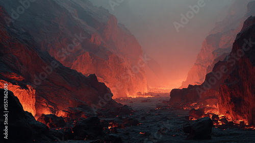 Fototapeta premium A dramatic volcanic terrain illuminated by glowing embers and molten lava,...