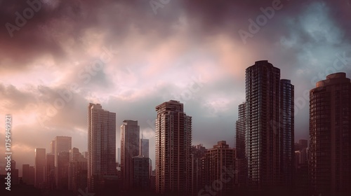 Fototapeta premium A dramatic warm toned cityscape featuring a dense cluster of urban...