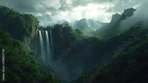 © Jack, Fototapeta premium A dramatic waterfall cascading into a lush green valley