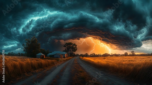© ainynoer, Obraz premium A dramatic weather theme unfolds with a powerful storm dominating golden fields. Lightning illuminates a rural landscape, enhancing its rustic buildings and winding dirt road.
