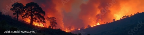© Prarittha, Fototapeta premium A dramatic wildfire engulfing a forested landscape under a fiery sky.