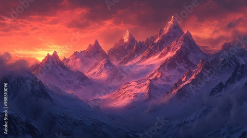 © Timeless Touch, Obraz premium A dramatic, windswept mountain range at twilight, with jagged peaks glowing under the last light of the setting sun.