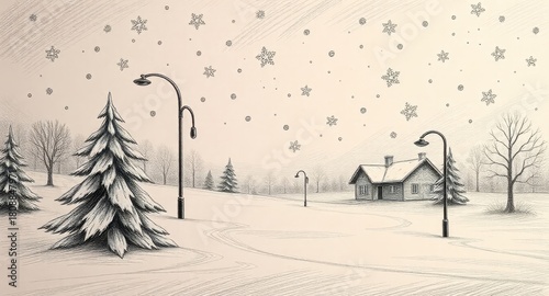 © Zhanbolat, Obraz premium A drawing of a snowy landscape with a house and trees