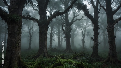 Obraz premium A dreamlike forest where misty tendrils embrace ancient trees, evoking an...