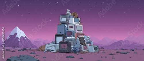 © Smaev, Naklejka premium A dreamscape of mountains and floating rocks set beneath a celestial canvas of stars