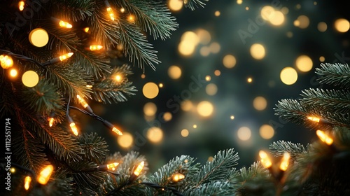 © Waseem, Fototapeta premium A dreamy abstract Christmas background with golden blurred lights scattered among deep green pine branches, giving a soft glow and warm ambiance.