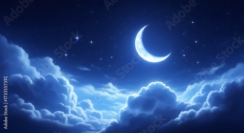 © NOVRIN, Fototapeta premium A dreamy and fantastical skyscape featuring a luminous crescent moon amidst soft, glowing clouds and a starry blue night sky