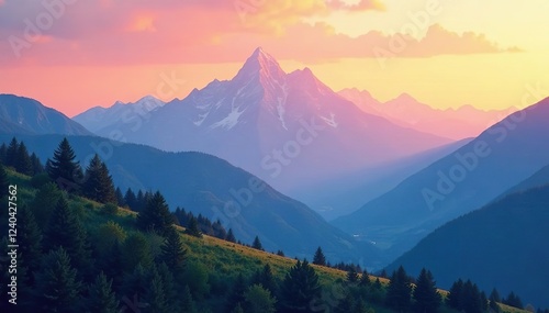 © Waramit, Obraz premium A dreamy blend of orange and blue hues fades over a serene mountain landscape, nature, peaceful
